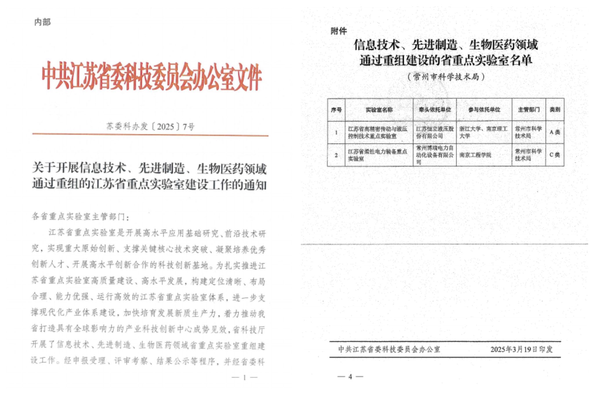 近日,中共江苏省委科技委员会办公室下发《关于开展信息技术、先进制造、生物医药领域通过重组的江苏省重点实验室建设工作的通知》(苏委科办发[2025]7号),正式批准2025年度江苏省重点实验室63个。常州博瑞电力自动化设备有限公司联合我校电力凯发、沈国荣学院共同申报的“江苏省柔性电力装备重点实验室”获批认定为江苏省重点实验室,实现了我校电力装备领域江苏省重点实验室立项建设突破。柔性电力装备是未来电网技术发...