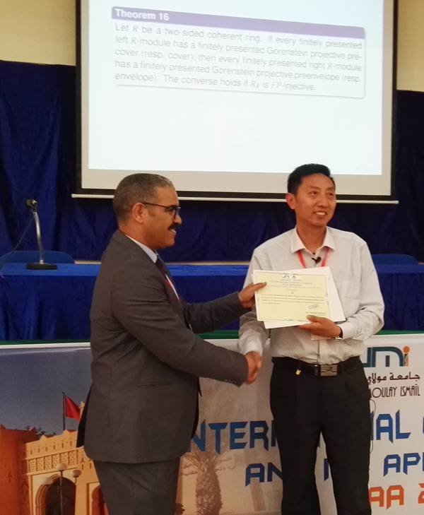 4月26日,国际代数学及应用学术会议(ICAA)在摩洛哥穆莱伊斯梅尔大学开幕。应会议组委会主席、穆莱伊斯梅尔大学数学系Abdellah Mamouni教授邀请,我校数理部毛立新教授参加了本次会议,并做了题为《Another Gorenstein analogue of flat modules》的大会邀请报告。他在报告中首次提出了glat模的概念。作为平坦模在Gorenstein情形下的另一种推广,毛立新教授证明了glat模类具有很好的封闭性质和相对同调性质,并得到了glat模和经典的Gorenstein平坦模的内在关系,同时给出了一些应用。这一最新研究成果引起了与会者的浓厚兴趣,报告结束后不少学者与毛立新教授进行了广泛深入的交流。