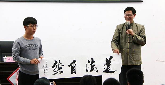 讲座中,陶敬玉老师紧紧围绕主题“从国学中感悟人生,从国学中汲取智慧”介绍了国学的概念,指出国学是历史的沉淀;讲述了国学的核心——人文精神的重要作用;阐述了国学中蕴含的人生智慧;指明了学习国学的方法和途径。讲座中,陶敬玉校友和现场小学弟学妹进行了热烈的互动交流,回答了如何让大学生更好理解“成功”与“成才”,如何让大学生懂得什么是“舍得”,什么是“道德”以及如何“做人成事”,如何让大学生树立正确的价值取向等问题,现场陶敬玉老师还向同学们赠送他的个人专著和书法作品。参加讲座的同学表示,陶老师在轻松愉悦的氛围中,向我们传递了中华优秀传统文化,也让我们明白了国学是中国传统文化的重要体现,是中华民族智慧的结晶,学习国学、领悟国学有助于青年学生更好地成长、成才。