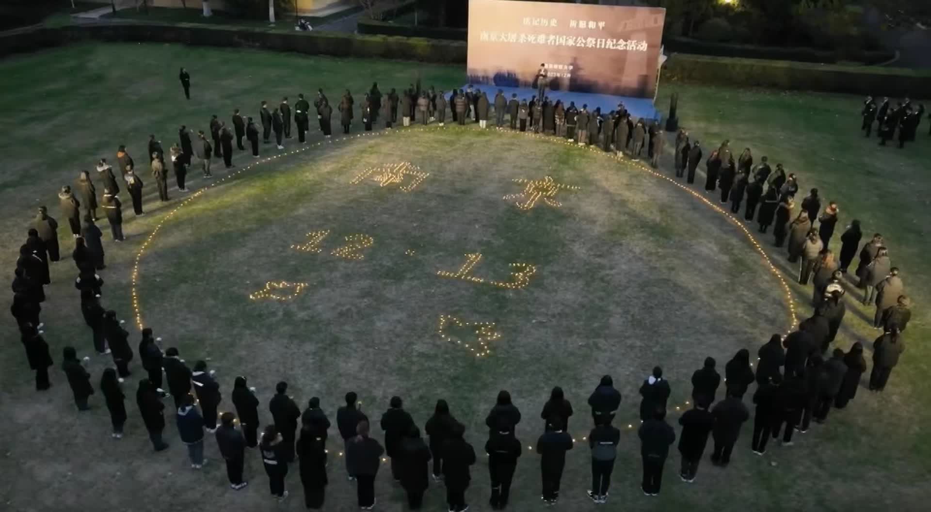 山河肃穆、草木含悲。12月12日,南京师范大学师生在随园校区举行“铭记历史 祈愿和平”南京大屠杀死难者国家公祭日纪念活动。1937年冬天,南师大随园校区曾是南京国际安全区,守护了数以万计的妇女儿童。活动当日,在100号楼前的大草坪上,上百名南师学子参加悼念活动,列队秉烛,用烛灯在草坪中央拼出“南京”“12.13”字样与“和平鸽”图案,以此表达对南京大屠杀遇难同胞的深深追思。在肃穆庄重的氛围中,同学们手捧蜡烛灯,围绕“南京”“12.13”字样与“和平鸽”图案静走一周,在荧荧烛火中缅怀逝者,寄托哀思,祈愿和平。