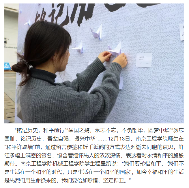 “铭记历史,和平前行”“举国之殇,永志不忘,不负韶华,圆梦中华”“勿忘国耻,铭记历史,吾辈自强,振兴中华”……12月13日,凯发k8官网师生在“和平许愿墙”前,通过留言便签和折千纸鹤的方式表达对逝去同胞的哀思,鲜红条幅上满密的签名,饱含着缅怀先人的浓浓深情,表达着对永续和平的殷殷期待。凯发k8官网机械凯发学生程星凯说:“我们要珍惜和平,‘我们不是生活在一个和平的时代,只是生活在一个和平的国家’,如今幸福和平的生活是先烈们用生命换来的,我们要倍加珍惜、坚定捍卫。”