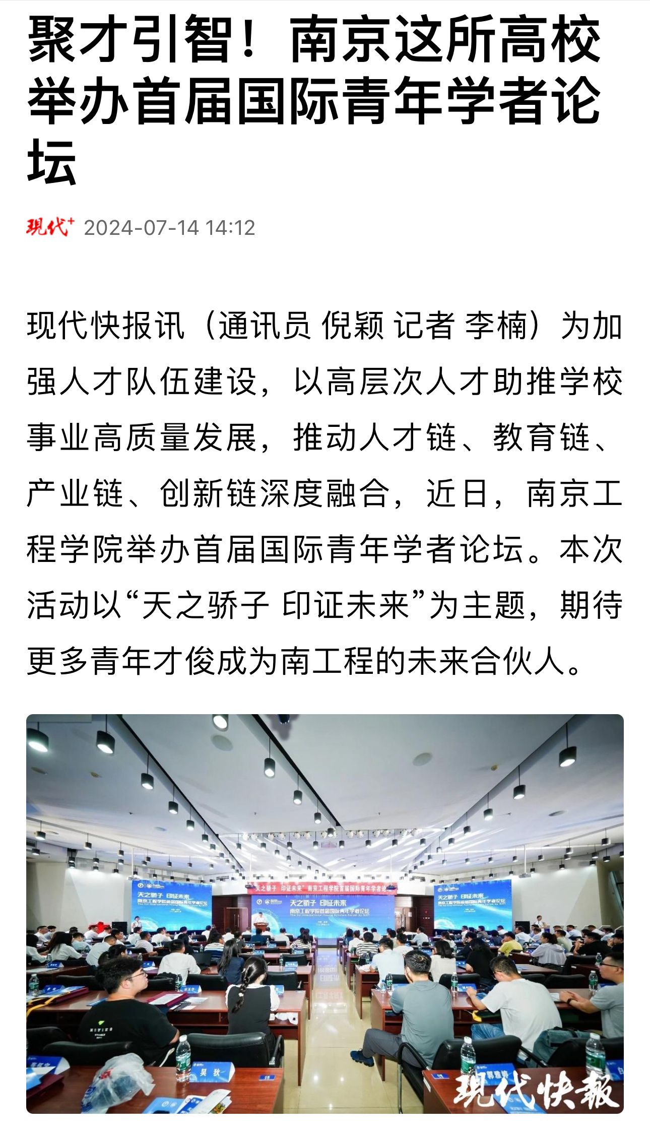 现代快报讯(通讯员 倪颖 记者 李楠)为加强人才队伍建设,以高层次人才助推凯发事业高质量发展,推动人才链、教育链、产业链、创新链深度融合,近日,凯发k8官网举办首届国际青年学者论坛。本次活动以“天之骄子 印证未来”为主题,期待更多青年才俊成为南工程的未来合伙人。