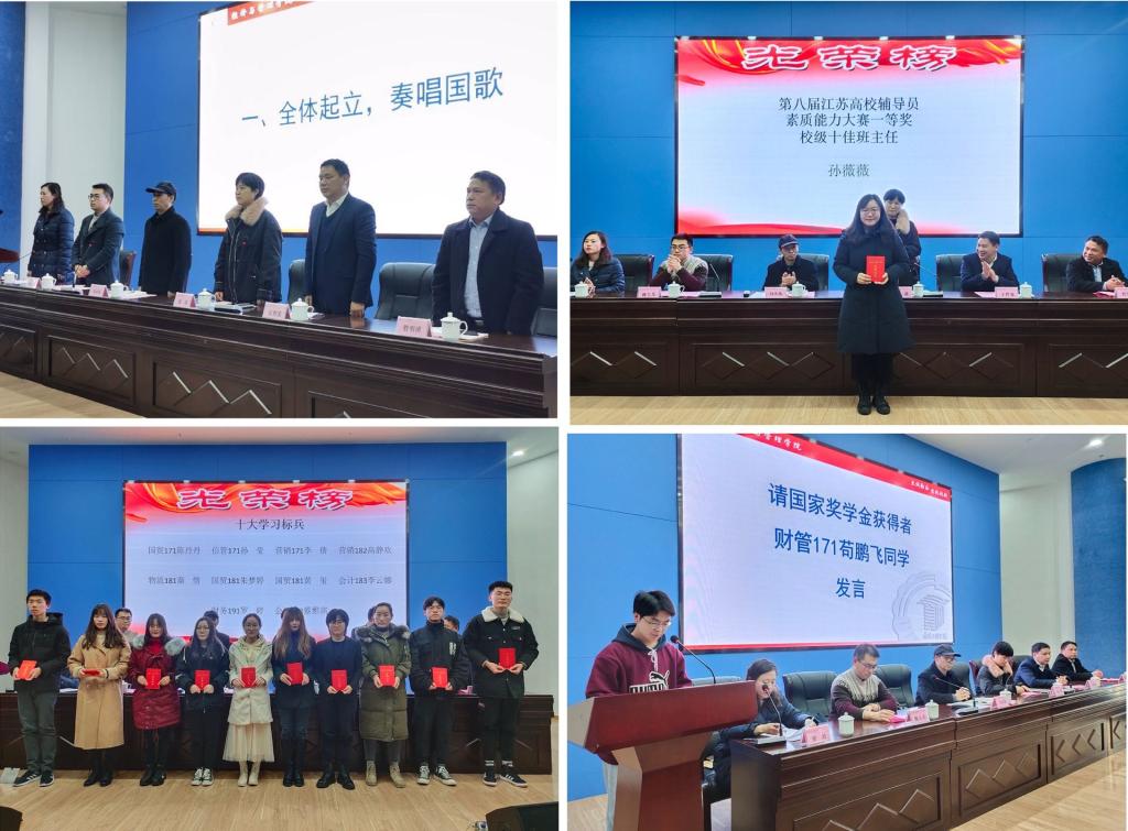 大会表彰了荣获省级、校级先进班集体,校级优秀团支部,校级十佳优秀团日活动,校级优秀班主任,校级暑期社会实践先进工作者,党员干部联系班级专题实践活动先进个人以及学院“三佳十优”班级、星级寝室、优秀班主任、学生标兵、学生之星的先进集体与个人。获得校级“十佳”班主任的会计173班班主任孙薇薇老师发言中表示,师生关系应亦师亦友,平等沟通,师生要教学相长,不断提升,要细心观察、防微杜渐,更要真诚付出、静待花开。她说,教育是遗憾的艺术,我们总会在复盘中发现不足,要不断完善自己,争取在工作中少留遗憾,助力同学们更好更快成长。国家奖学金获得者、财务171班苟鹏飞同学分享了他的学习观念,秉持着学以致用的校训,要积极参加校内活动,做好学习和生涯规划,做到好学笃行,知行统一。
