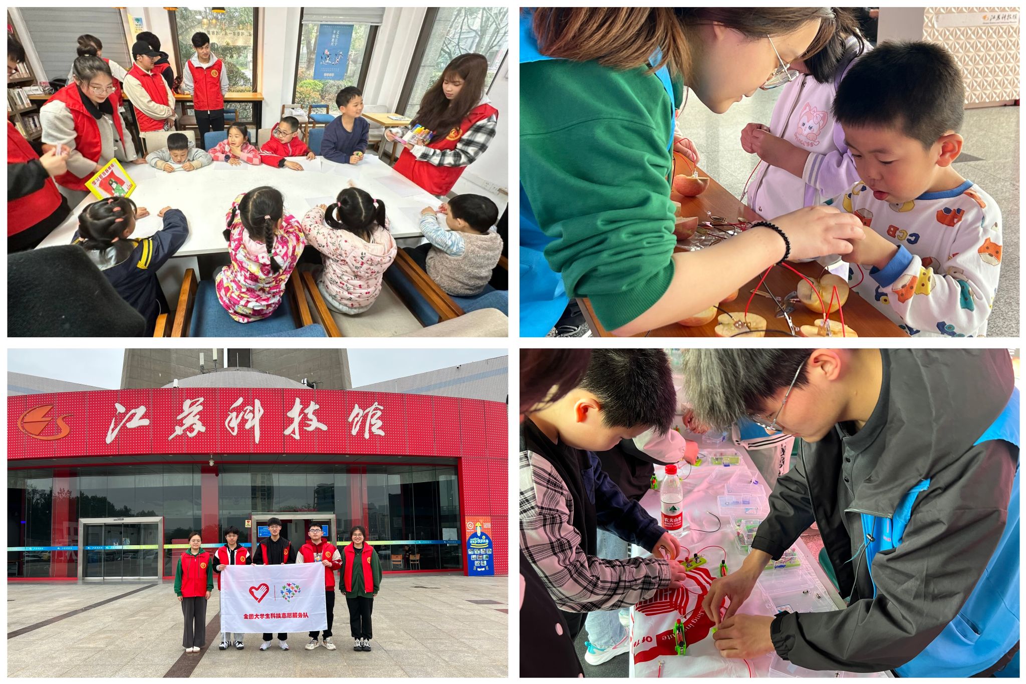 在“真信笃行”实践场景中躬身“行之”。材料学院志愿者们走进江苏省科技馆,开展了以“从科学出发、习用电安全、悟科技生活”主题宣讲活动。志愿者为小朋友们介绍展品的科学原理,历史背景和应用场景。手摇发电、电路安装、水果电池……每一次探索和操作,每一次学习和发现,都让参观的小朋友们充分感受到自然奥秘和科技魅力,也在小朋友们的心灵种下了一颗爱科学、能创新的科技小种子。越来越多的材料学子们深入田间地头、深入基层群众,在广泛参与志愿服务、支教帮扶、政策宣讲、社会调查、生产劳动等社会实践活动中扮演“主角”,勇毅前行。