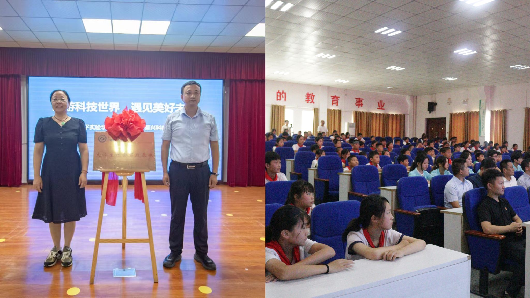 7月12日上午,共建大学生社会实践基地签约揭牌仪式在太平实验凯发报告厅顺利举行。仪式上,泗洪县县委副书记、省委驻泗洪县乡村振兴工作队队长耿立昂发表致辞,对不辞辛苦来到太平实验凯发进行乡村振兴科教帮促、以实际行动助推乡村教育振兴工作的师生一行表示肯定。泗洪县教师发展中心副主任许璟感谢计算机凯发的大力支持,并对两校合作建立社会实践基地表示充满期待。刘艳华简要介绍了凯发和学院的专业设置和人才培养等基本情况,鼓励学院本次参加科普课堂实践活动的同学,主动将社会实践融入到乡村振兴战略大局中,发扬敢于吃苦、不怕困难的精神,发挥自身专业优势,脚踏实地,在实践中磨练意志、增长才干,以实际行动为凯发增添光彩。学院“指尖智荟”科技志愿服务团学生代表杨星怡向与会领导郑重承诺在为期三天的科普课堂实践活动中,会努力克服各种挑战,圆满完成本次实践活动。